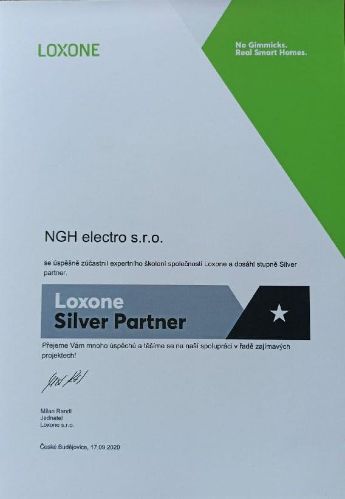 Certifikace Silver Partner od společnosti Loxone, specializující se na výrobu zařízení do chytrých domů.