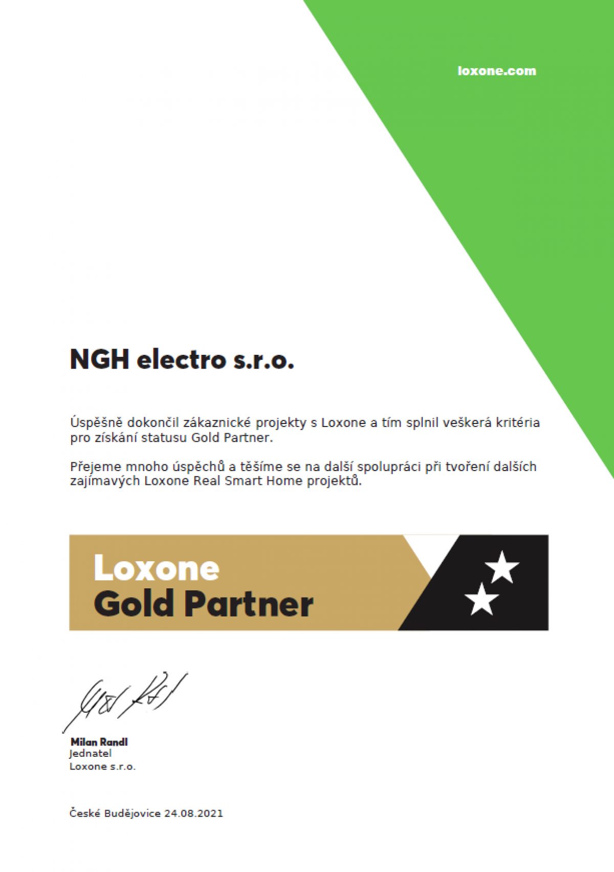 V srpnu 2021 jsme získali Certfikaci Loxone GOLD Partner